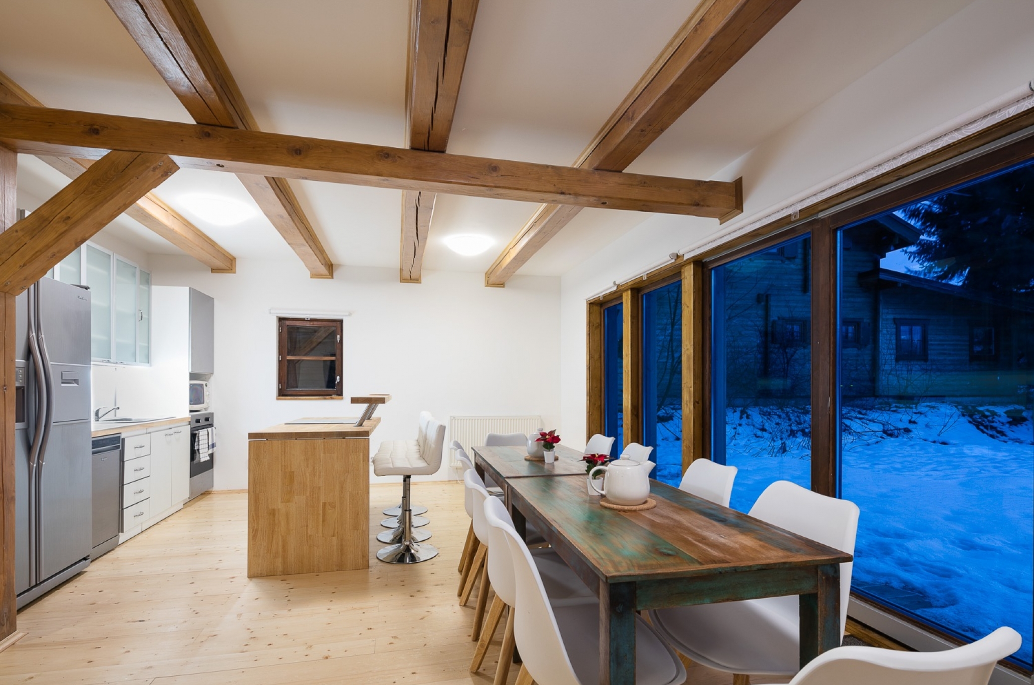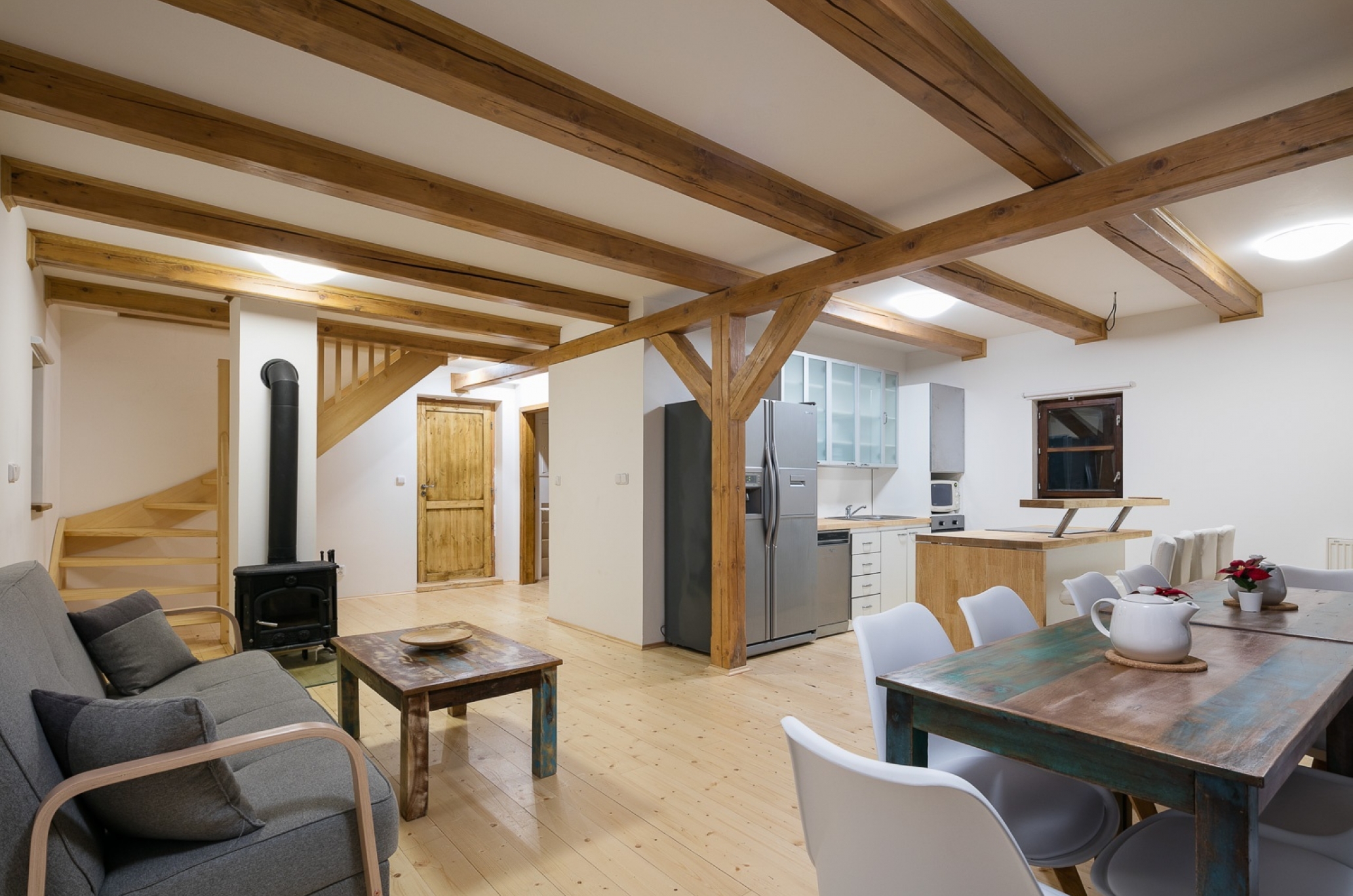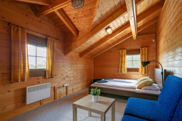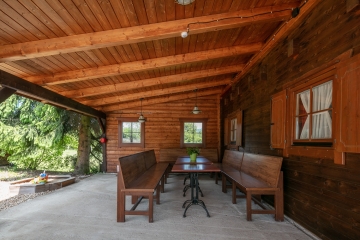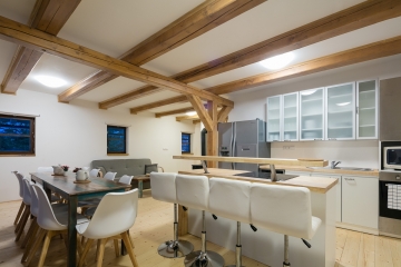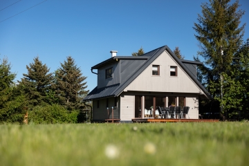 Cottage for 10 persons. This cottage is a totally new one. This luxurious premises offer accommodation for 10 persons (6 beds, 4 extra beds). On the ground floor you will find a large and well equipped kitchen, dining area, fireplace stove, bathroom with tub, and television. On the first floor there are 3 bedrooms and smaller bathroom. You can spend your time on a large outdoor terrace and enjoy barbecue. Parking at the cottage is available.