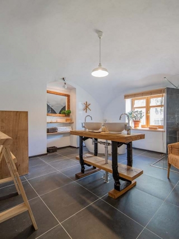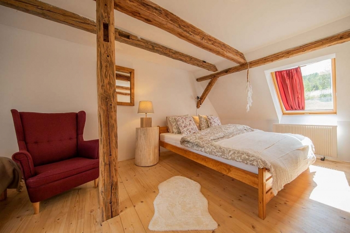 Есеники – живописное место с чистым воздухом и прекрасной природой. Среди местных лесов, на краю деревушки Скрбовице расположился дом с очень интересным прошлым и не менее интересным настоящим. Изначально это был паб середины 19-го века, сегодня это полностью реконструированный коттедж и идеальное место для семейного отпуска, спортивного и размеренного отдыха, для встреч с друзьями, семейных торжеств или короткого отдыха от повседневной суеты. На первом этаже коттеджа расположена большая гостиная (бывший пивной зал), оборудованная современной кухней, с большим обеденным столом, диваном и телевизором. Из гостиной есть выход на просторную веранду. На первом этаже находится также одна из спален с двухъярусной кроватью для 4-5 человек, а также современная ванная комната как с душевой кабиной, так и с удобной ванной. Отреставрированная лестница в коридоре ведёт на мансардный этаж, где расположены ещё две комнаты. Первая более просторная – для 4-х человек. Вторая чуть поменьше также для 4-х человек с диваном-кроватью. На мансардном этаже есть второй туалет с небольшой раковиной. Возле дома оборудована зона отдыха с барбекю и местом для костра, под верандой – новая сауна с холодной купелью. Поскольку дом располагается около велотрассы, здесь есть отдельное помещение для хранения велосипедов (зимой – для лыж) с возможностью подзарядки электровелосипедов. В общем, осталось только приехать.