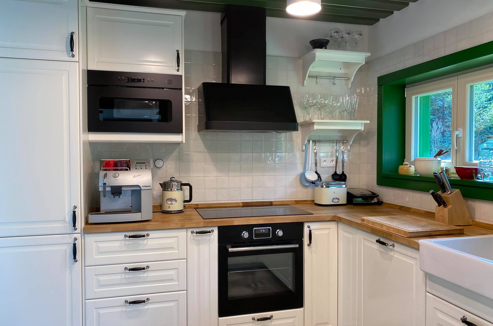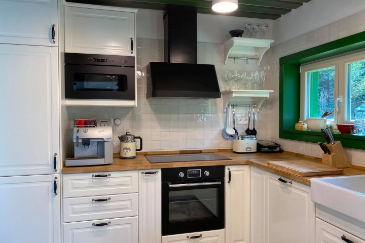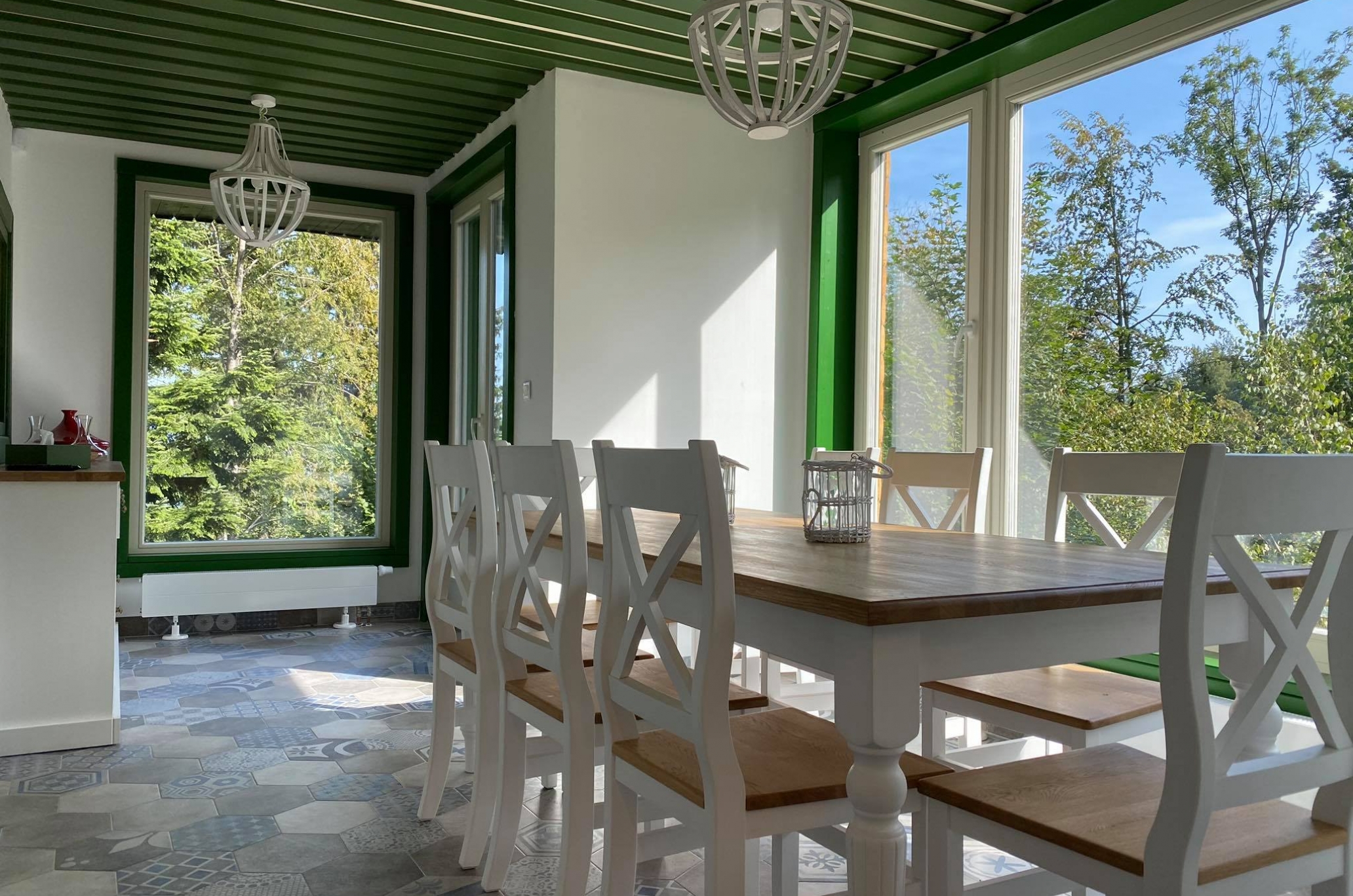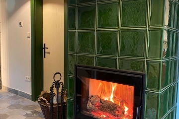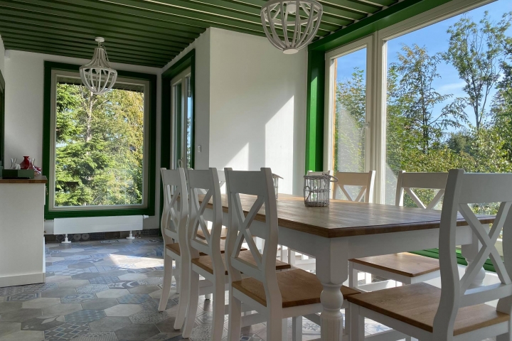 Застеклённая веранда является неотъемлемой частью этого дома с потрясающим видом на природу. Очень приятная и уютная атмосфера, чему способствует красивая изразцовая печь в гостиной. Велнес на лоне природы - это настоящий отдых для души и тела и незабываемые впечатления.