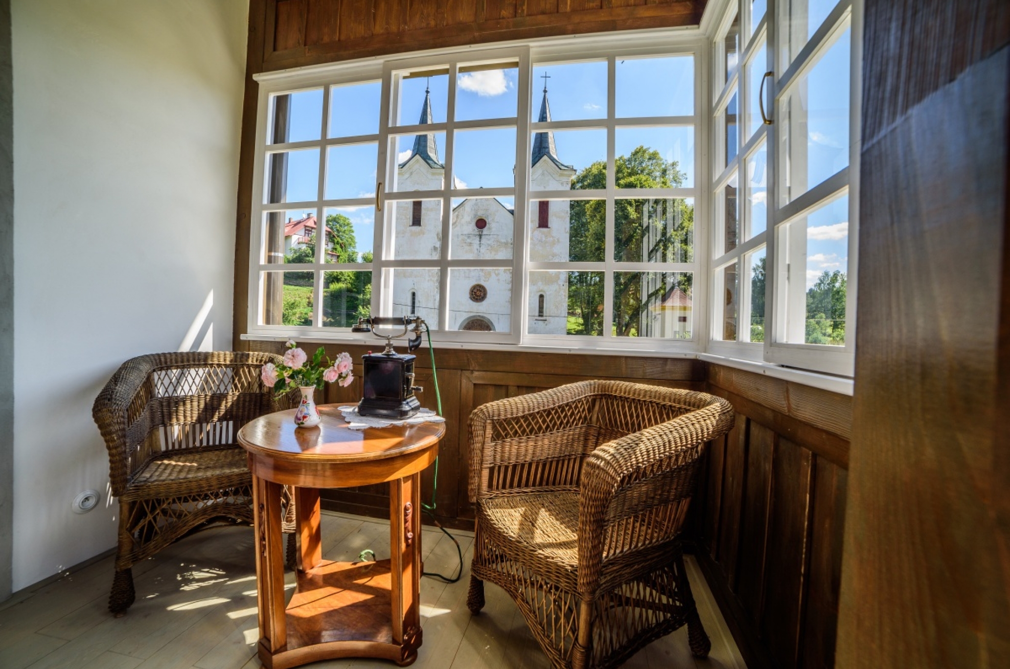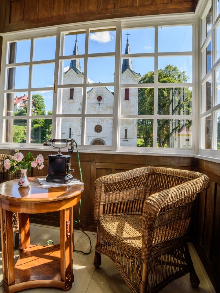 Z oken je krásný výhled na přírodu Šumavy a na poutní kostel.