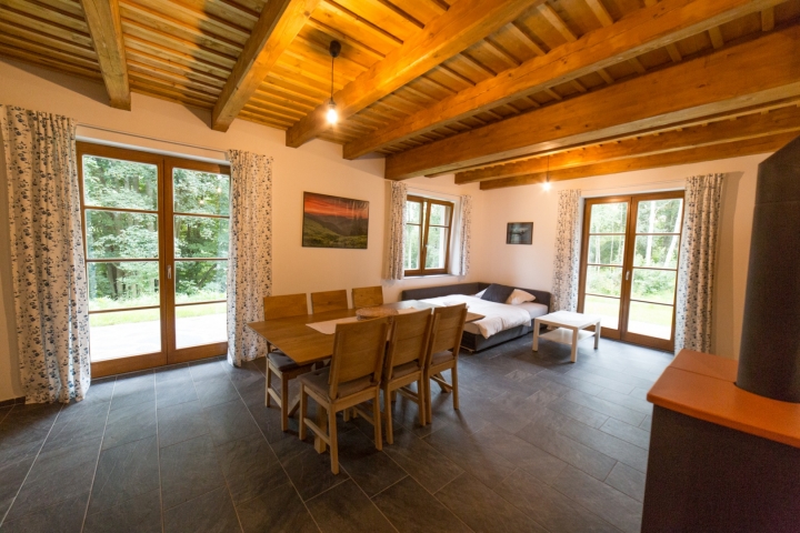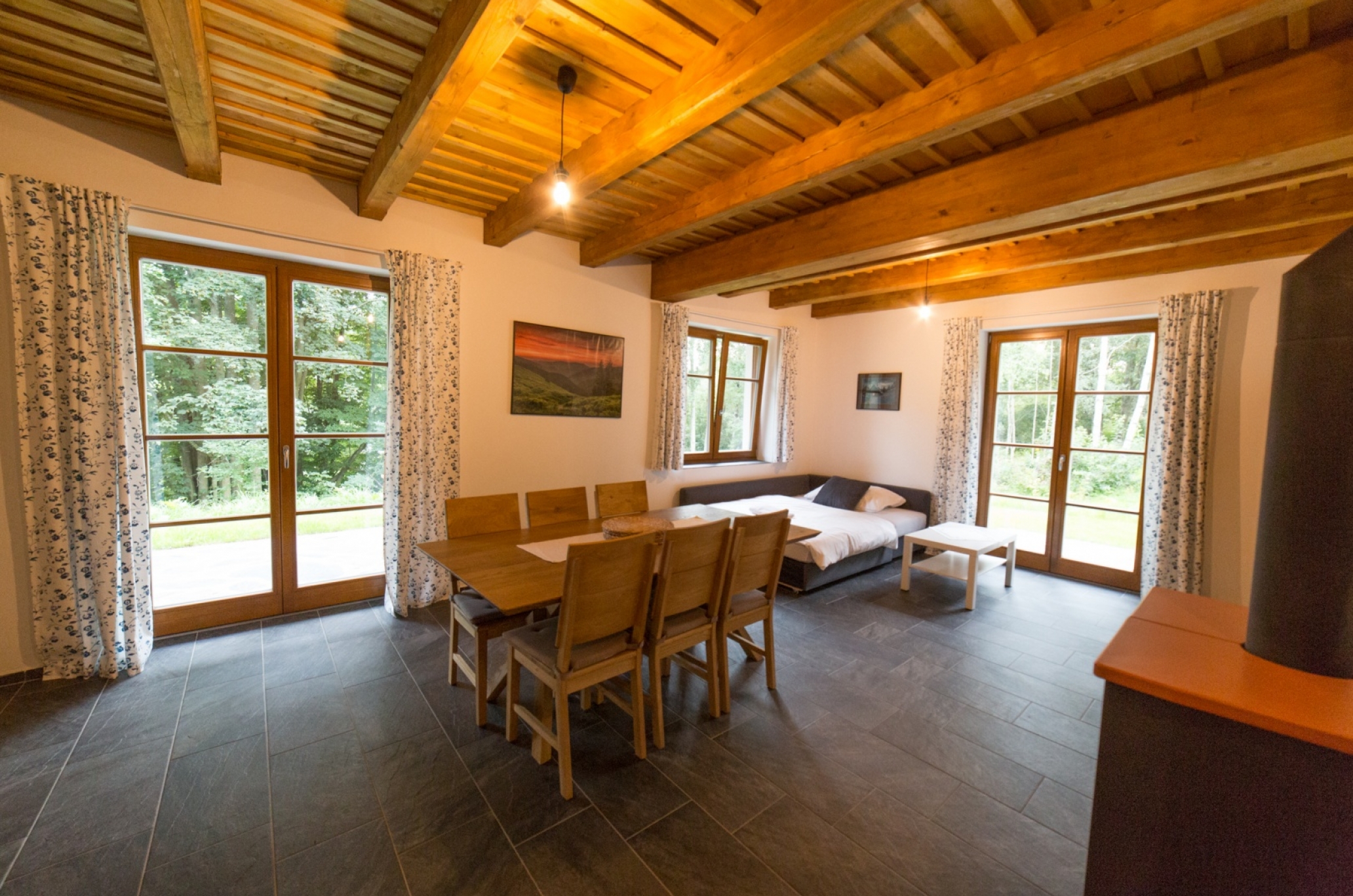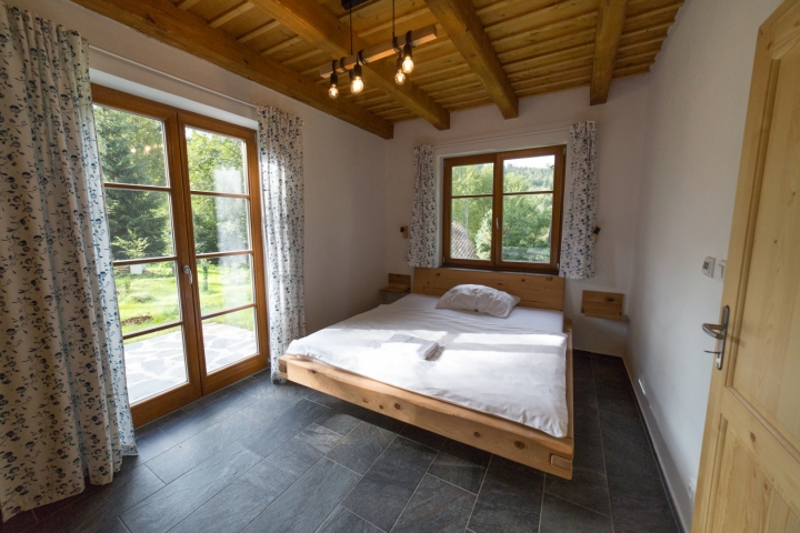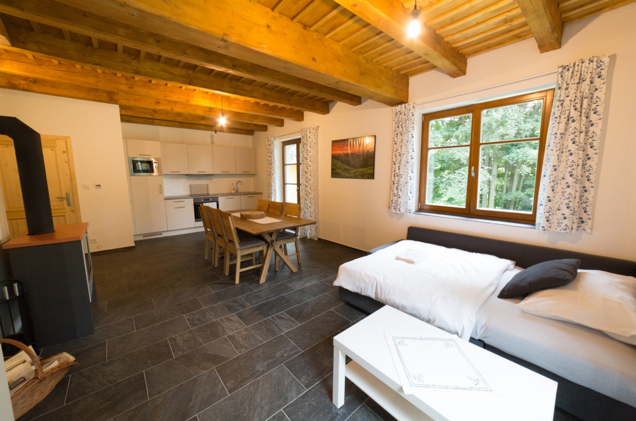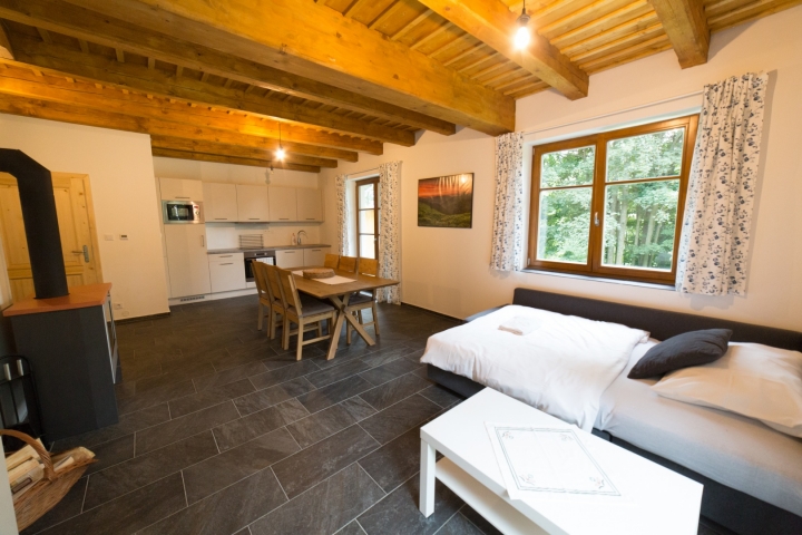 Загородный коттедж U Staré hájenky («Старый охотничий домик») укромно расположился у самого леса, в дикой природе Пржемысловской седловины, окрестностях национального природного парка Есеники. Дом разделён на 4 одинаковых по площади апартамента (54 кв. м) с общей комнатой для хранения лыж и велосипедов. Два апартамента с отдельными выходами на террасу находятся на первом этаже. В одном из них имеется одна спальня, гостиная с кухней и ванная комната. В другом, более подходящем для семейного отдыха с детьми, есть две спальни, отдельная кухня и ванная комната. На втором этаже находятся ещё два апартамента. Каждый из них имеет одну спальню, гостиную с кухней и ванную комнату. Просторный практичный интерьер каждого апартамента предназначен для размещения 2-5 человек. Здание отапливается полами с подогревом, во всех апартаментах есть камин. Если вы ищете комфортное проживание в спокойном и тихом месте с возможностью активного отдыха на природе (лыжи, пешие прогулки, велотуризм), то вам понравится этот уютный коттедж в окружении заповедной чешской природы.