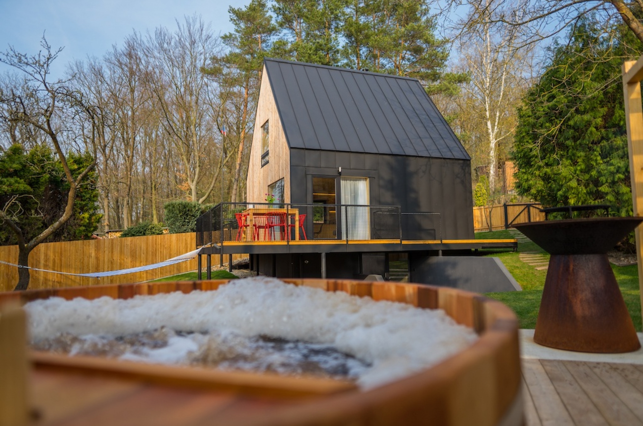 Třípatrová chata je ideální jak pro pár, tak pro rodinu s dětmi. Na rozlehlé zahradě si své užijí malí i velcí. Najdete zde dětské hřiště s malou horolezeckou stěnou a houpačkami. Dospělí si zase mohou vychutnat relax ve venkovní houpací síti Hastens a posezení u parádního grilu Taranis.