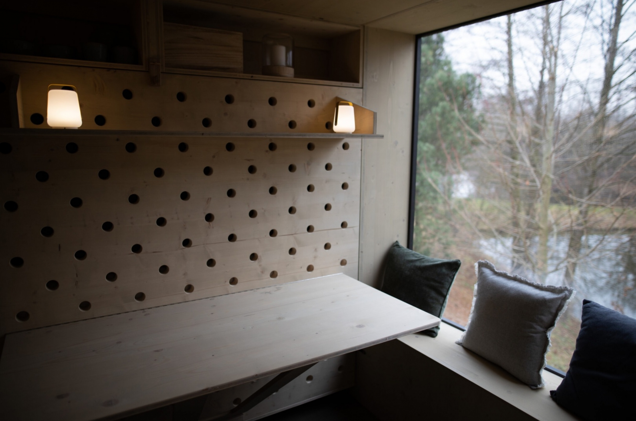 Vychytávky, jako skládací postel, umožňují v mžiku změnit spodní část posedu v taneční parket či romantickou jídelnu.