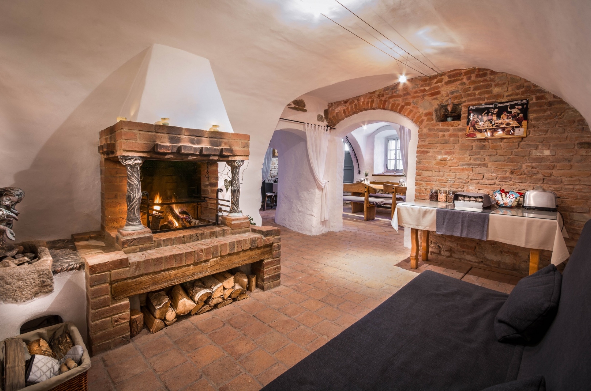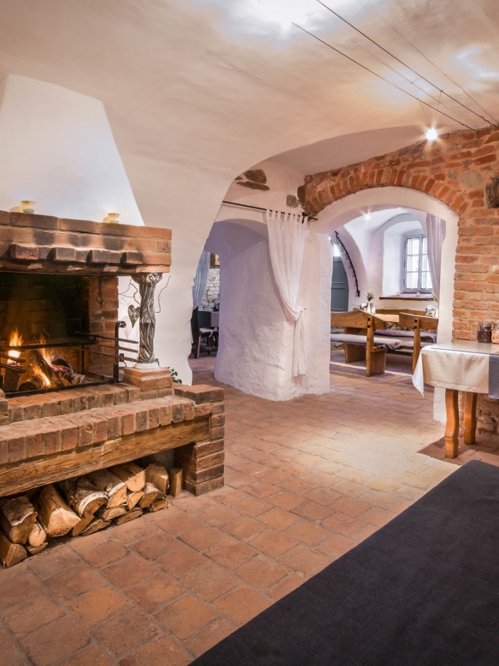 Ve společných prostorách je i jídelna ve sklepení, kde se denně podává snídaně formou bufetu. Ve vinárně s otevřeným krbem si můžete vybrat z široké nabídky moravských vín.