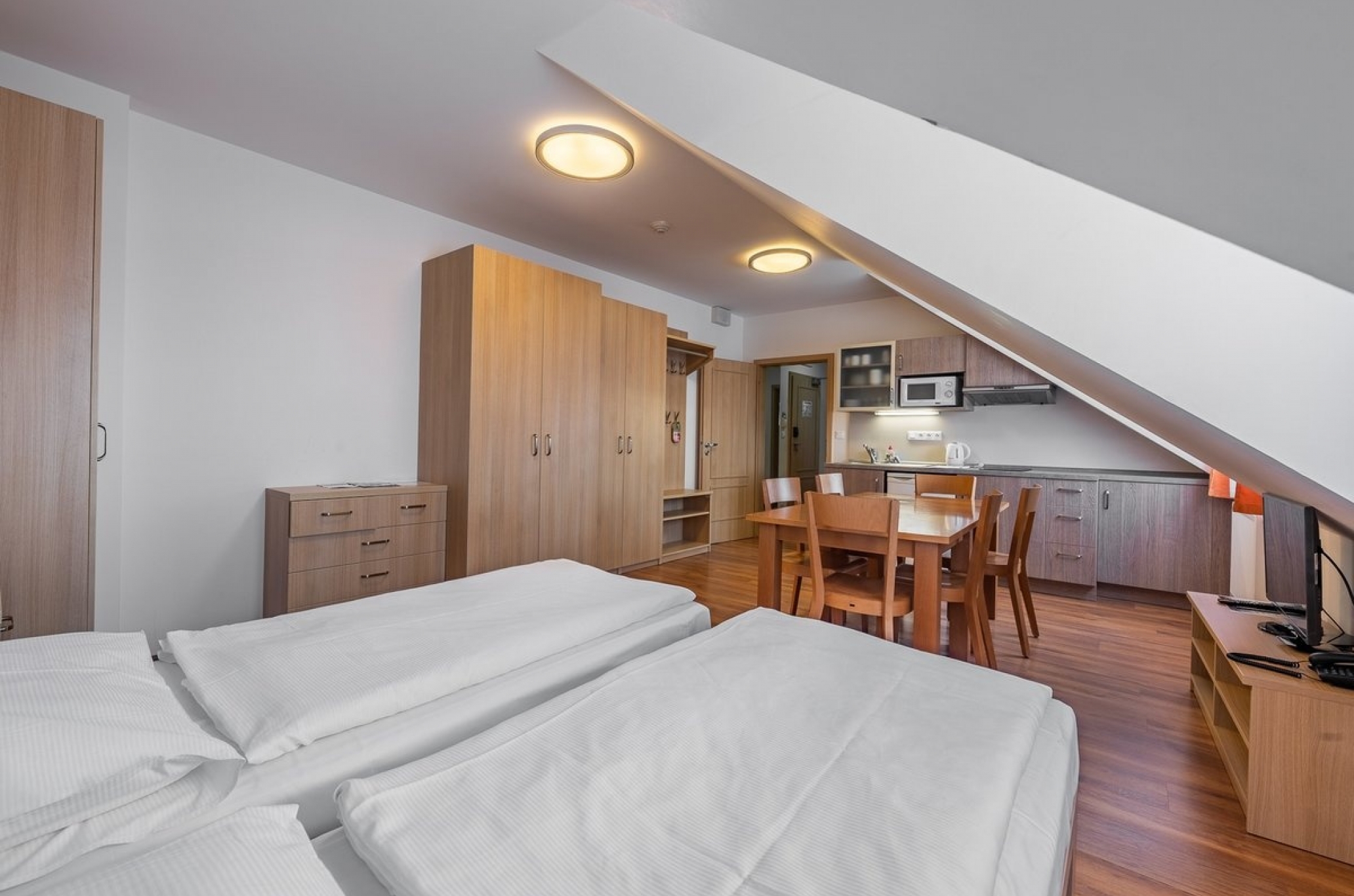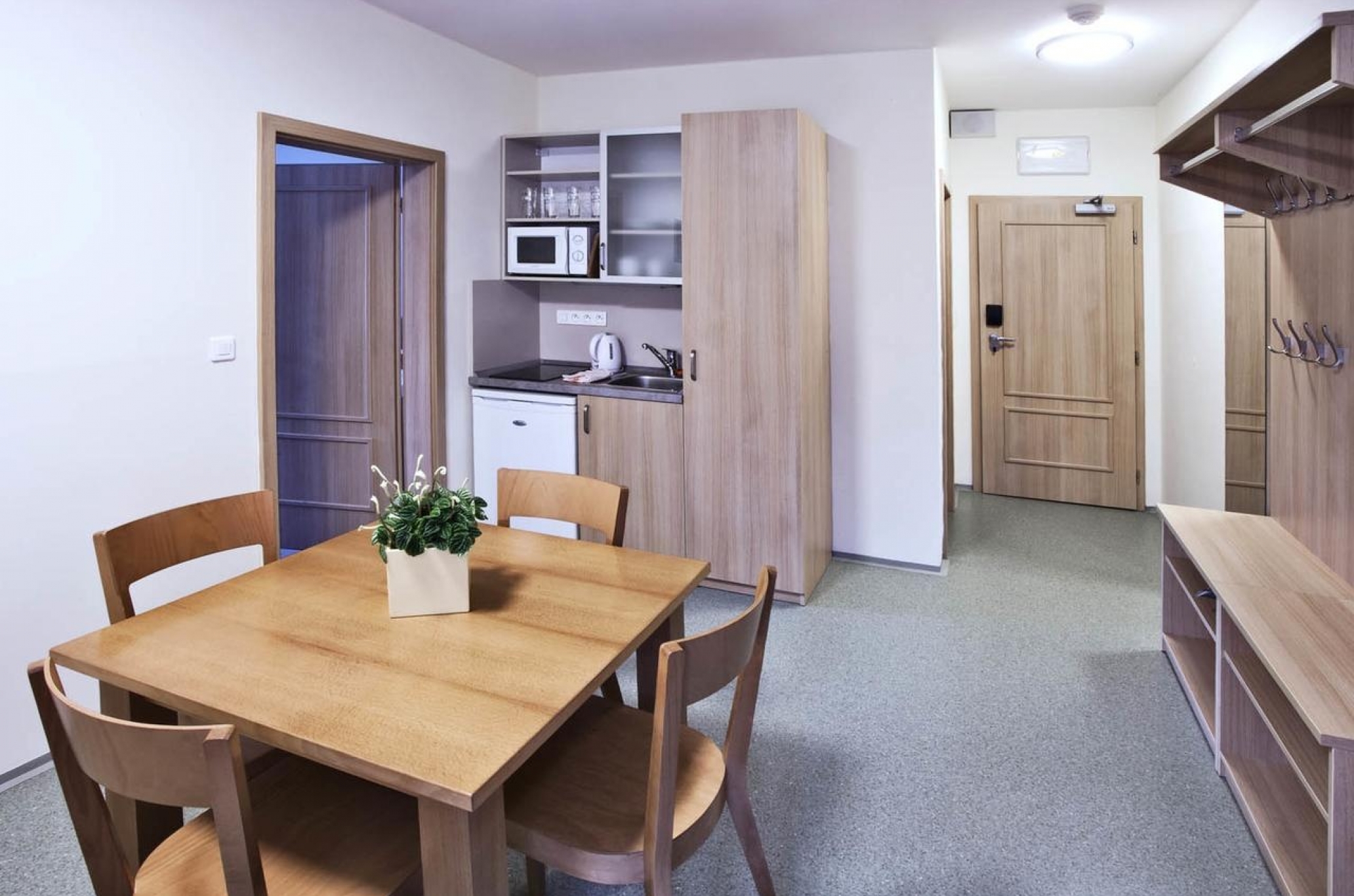 Prostorné velmi dobře vybavené apartmány adostatkem úložných prostorů.