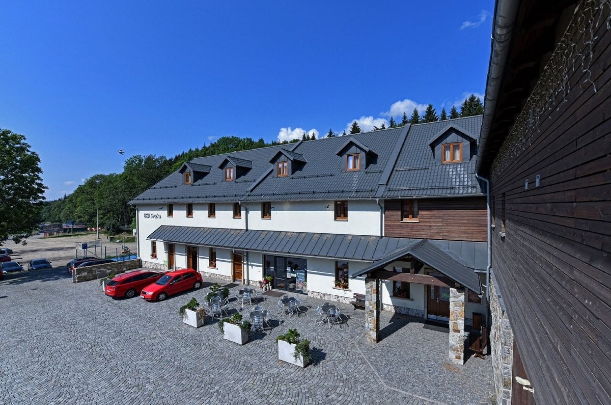 Přímo u Stezky v oblacích se nachází prosklená panoramatická Restaurace Skalka s posuvnou střechou a venkovní terasou s nádhernými výhledy na okolní hory. Vzdálenost pouhých 4,5 km.