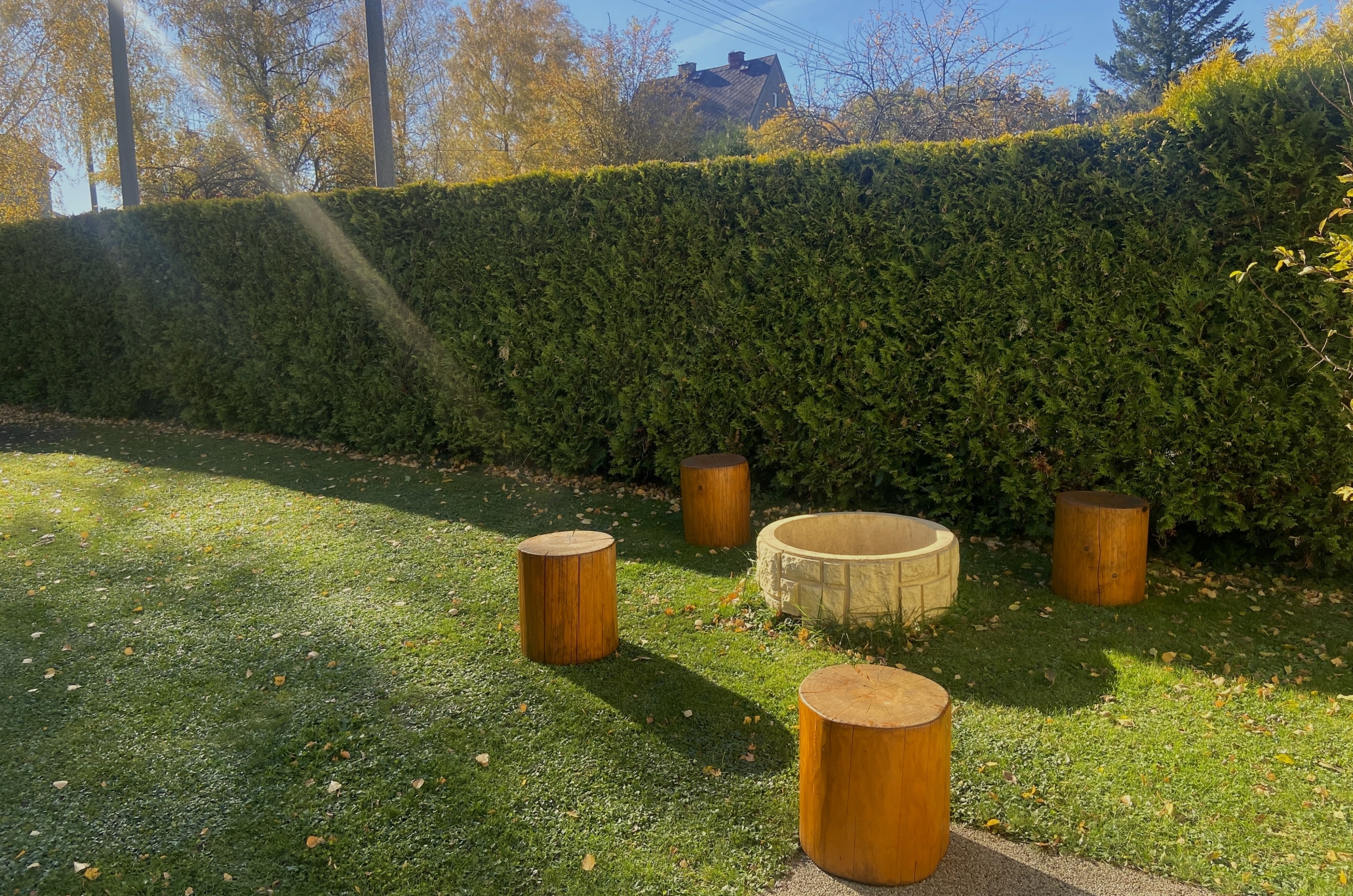 V kouktku zahrady jetaké možnost rozdělat ohýnek v místním ohništi a opéct si třeba buřty. Okolo jsou kmeny stromů k příjemnému posezení.