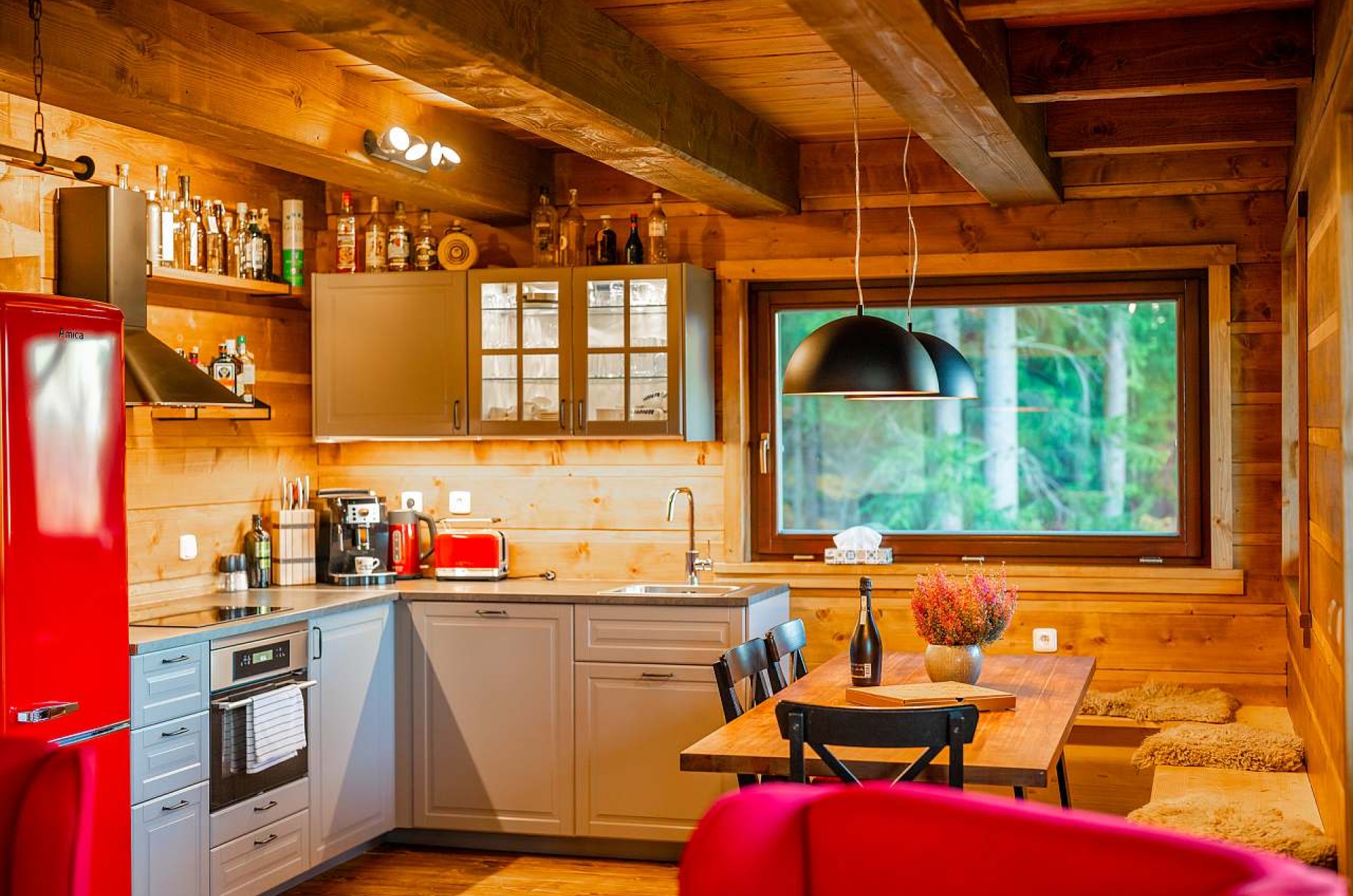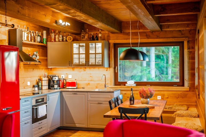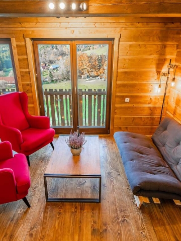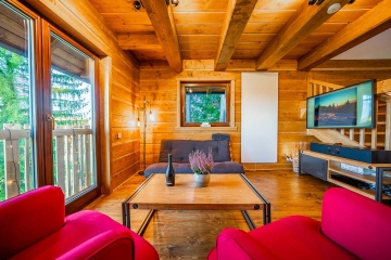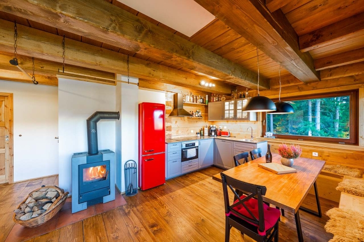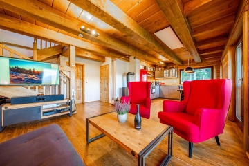 Roubená novostavba z roku 2020, obývací pokoj s kuchyní a krbem, posezení s neokoukaným výhledem na Radhošt.
