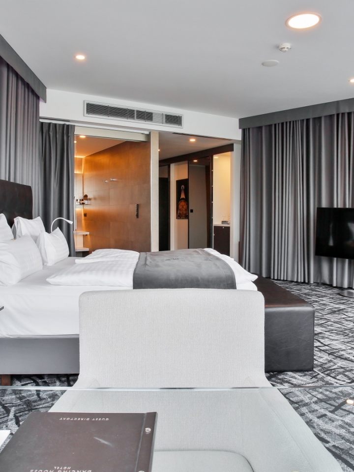 Zažít noc v Tančícím domě je zážitek. Už jen pocit, že spíte v budově, kterou si každý den fotí stovky turistů, protože jde o klenot moderní architektury v Praze. Výhled na Vltavu a Pražský hrad je jedinečný z pokoje, i z terasy, na kterou máte samozřejmě jako hotelový host přístup. Pokoje jsou moderně zařízené, můžete si tu pohrát s atmosférou díky barevným LED světlům. V restauraci vaří skvěle, proto neprošvihněte romantickou večeři, ani snídani. Ideální pro oslavu narozenin, výročí apod.