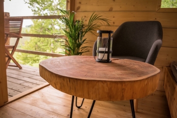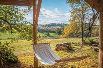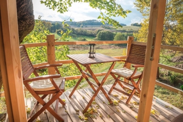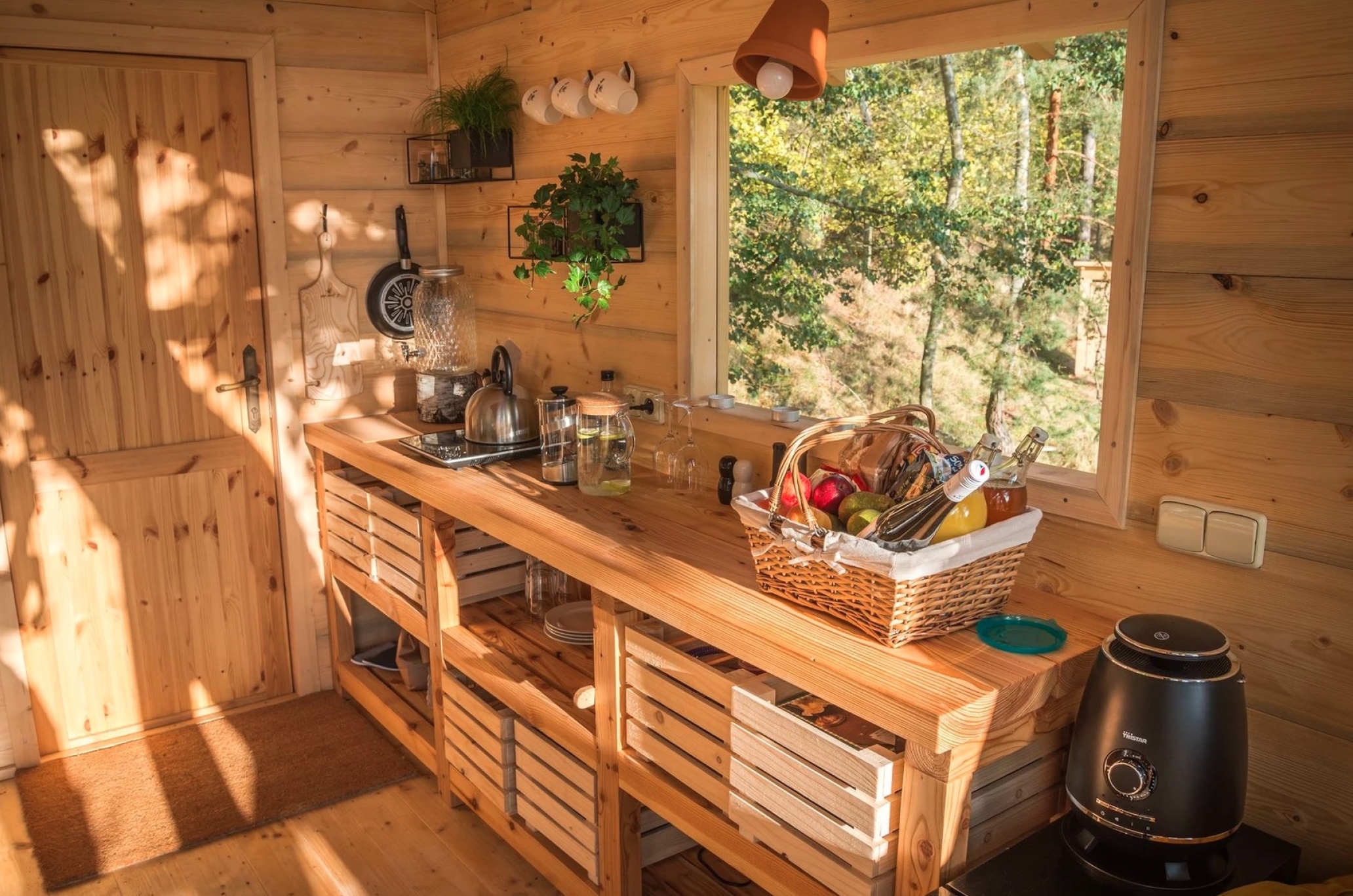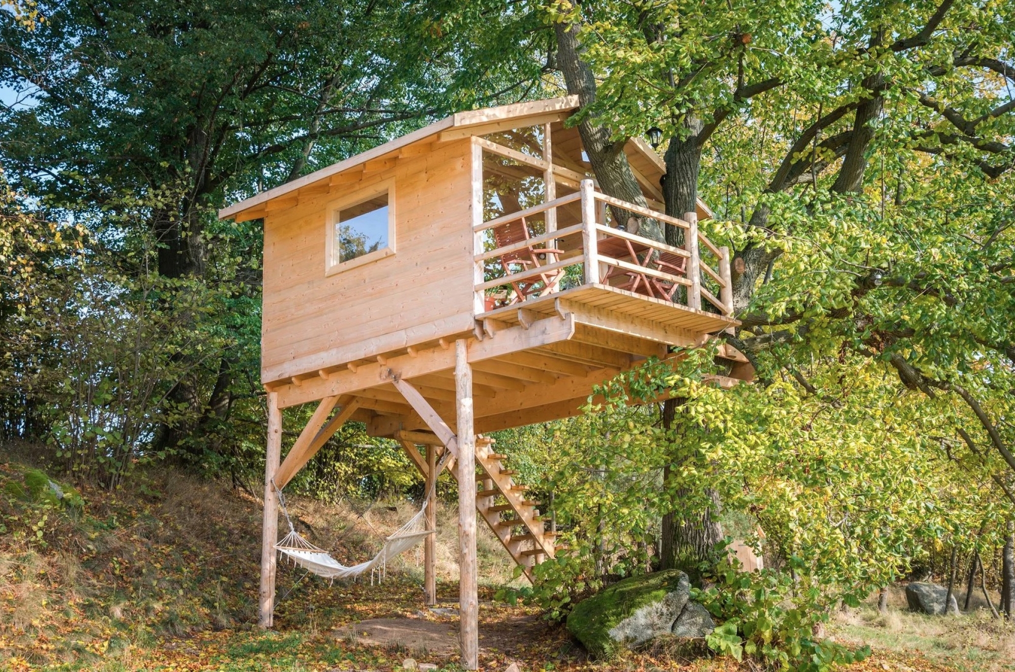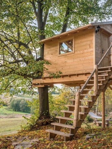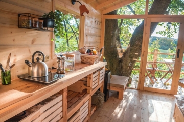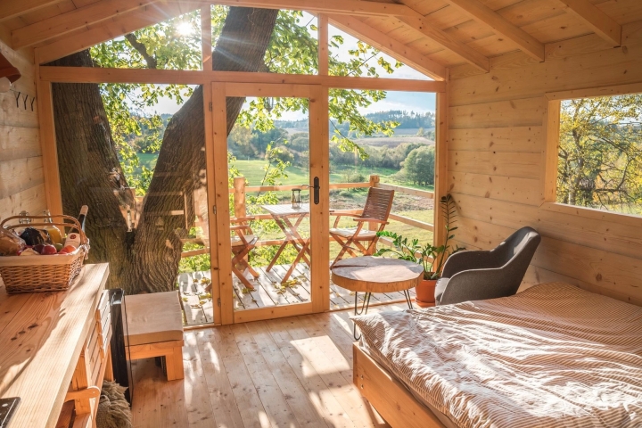 Pokud hledáte špetku odreagování, soukromí a naprostého klidu, tenhle treehouse bude to pravé místo pro vás. A teda ještě pro jednoho nocležníka. Hlavní dominantou celého prostoru je prosklená stěna na balkon, která umožňuje pozorovat okolní krajinu přímo z pohodlí postele. Uvnitř najdete i kuchyňský kout s vařičem a vybavením. Pohodlného odpočinku si pak můžete vychutnat třeba při sklence vína na venkovní terase.