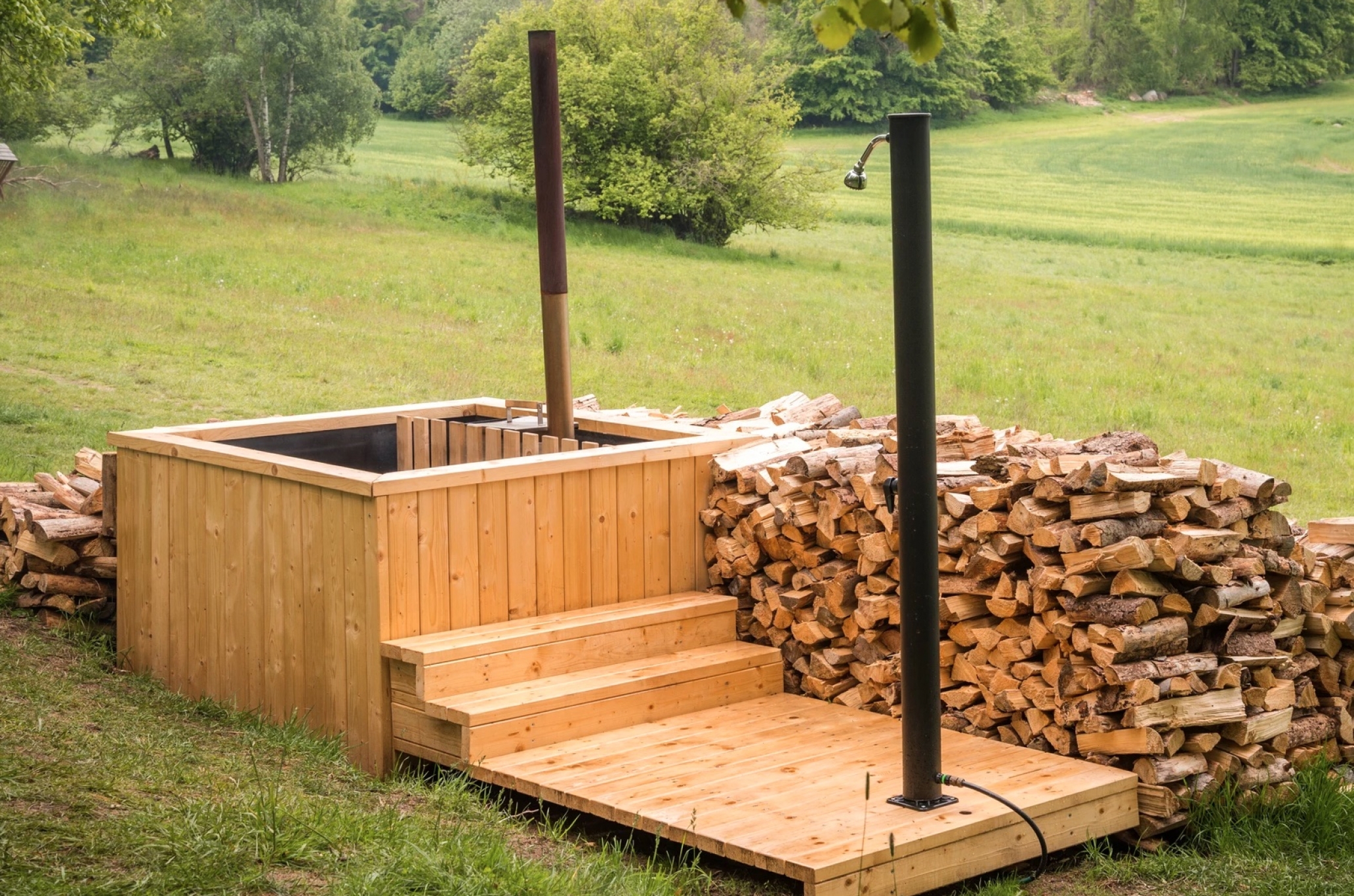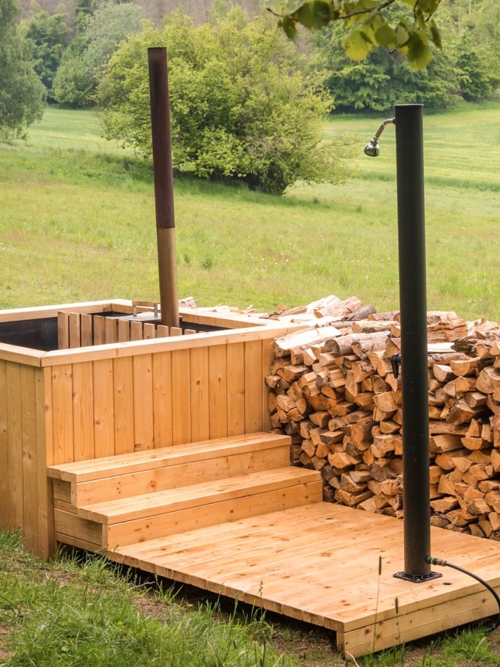 Možnost využití koupacího sudu s vnitřním kotlíkem na dřevo.