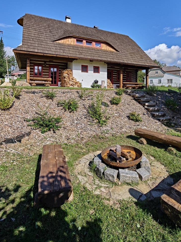 Součástí roubenky je i soukromé wellness, kde najdete moderní saunu a venkovní horkou lázeň.