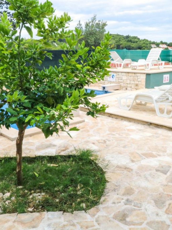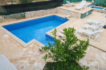 Villa Dvornik nabízí naprosté soukromí v pohodlném ubytování rodinám s dětmi, studentským skupinám a vícegeneračním rodinným setkáním. Má výhled na moře a je jen 300 metrů od moře a pláže. Obytná plocha 135 m2, velká zahrada 280 m2 lemovaná kamennými deskami, 5 pokojů (10 lůžek a dvě přistýlky) a dva bazény. Velký bazén se 4 masážními tryskami o velikosti 24 m2 a hloubkou 1,5 m pro dospělé a menší bazén určený pro malé děti o velikosti 3,5 m2 a hloubce 0,5 m. od 21 ° C v květnu a říjnu. V okolí domu je venkovní sprcha a gril. Dům je klimatizovaný a má bezdrátové připojení k internetu. V okolí domu jsou zajištěna tři parkovací místa. Domácí mazlíčci jsou vítáni.